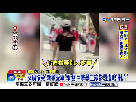 高雄前鎮,一輛白車停在停車格,被人噴上綠色噴漆,女子噴漆過程被拍下,疑似是報復前男友的現任女友,大喇喇噴漆毀車。另外楠梓區路口,2名騎士發生行車糾紛,其中一名男子拿出短球棒,怒敲對方安全帽,雙方路口飆罵要輸贏,但警方到場時已經離開,將通知雙方到案說明。
