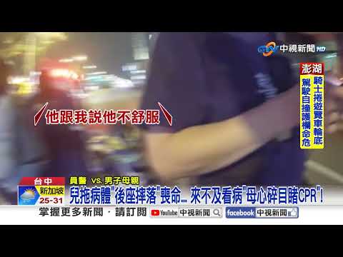台中南區,有轎車過彎失控撞翻,連滾兩圈,衝到對街,還猛撞路邊轎車,相當驚險;而台中大里則有名43歲男子,疑似生病,媽媽騎車載他,要前往醫院就醫,沒想到他突然無力,從機車上滑落,失去生命跡象,雖然一度救活,但最終經過三個小時搶救,仍是回天乏術,死因有待釐清。